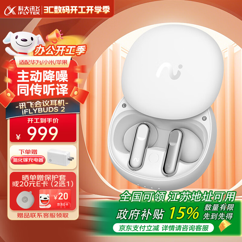 科大讯飞录音降噪会议蓝牙耳机iFLYBUDS 2 半入耳主动降噪 同传翻译 政府补贴【冷霜白】适配苹果华为小米价格:999.00元!