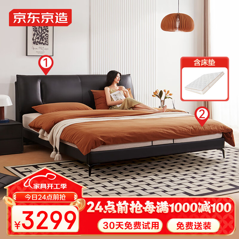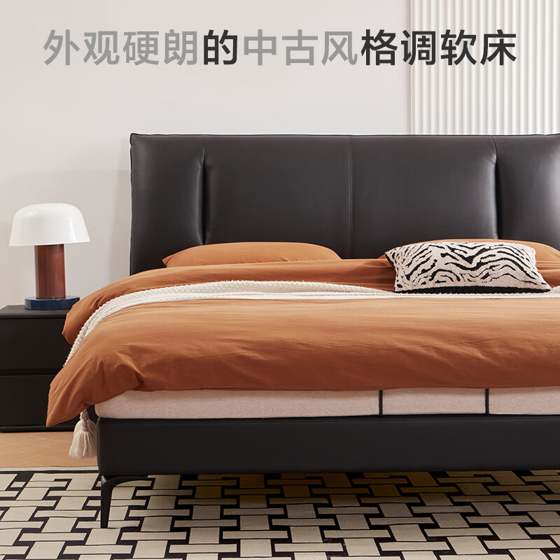 京东京造家居大黑牛真皮床套装 荷兰头层牛皮 软硬两用弹簧床垫1.5×2米黑价格:3599.00元!