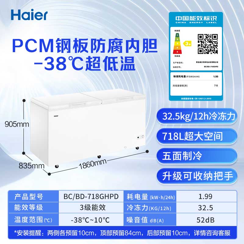 给大家分享下!实实在在的说这款海尔BC/BD-718GHPD是我喜欢的外观,质量还不错,外观简约大气,颜色纯白,让人感觉干净整洁。柜深容量大,与同容量的其他品牌冰柜相比,此款冰柜外形尺寸很节约空间,家用商用两不误