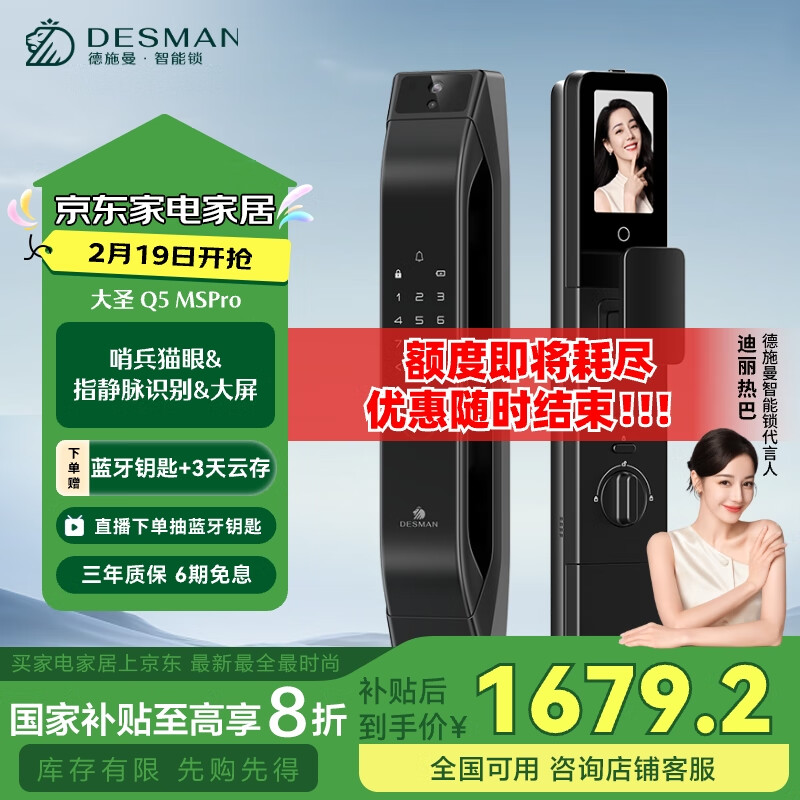 德施曼(DESMAN)智能门锁 指静脉识别哨兵智能猫眼大屏指纹密码锁 大圣Q5MSPro价格:2099.00元!