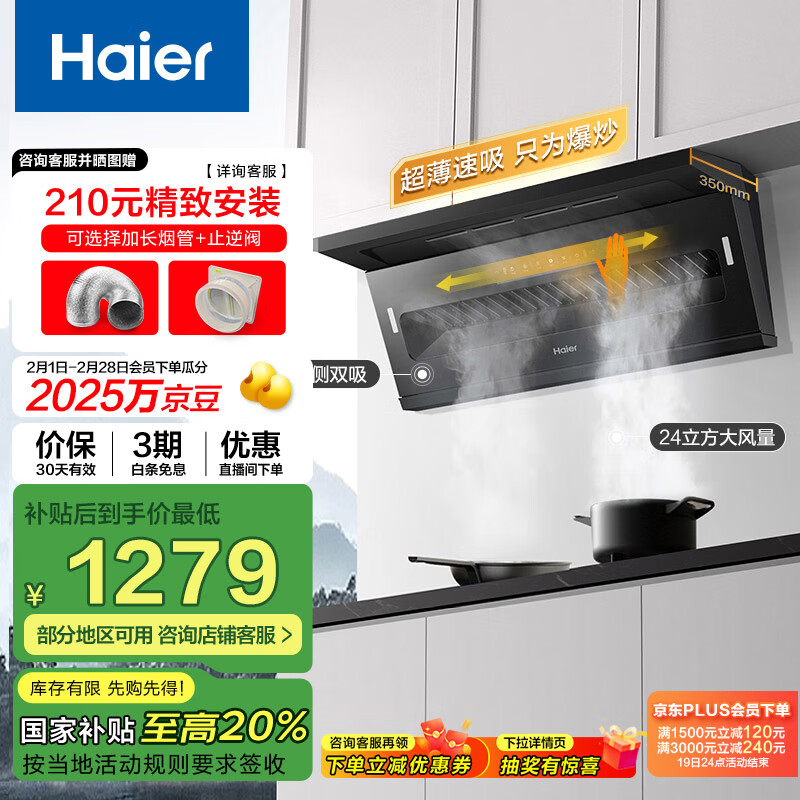 海尔(Haier)抽油烟机 顶侧双吸大嘴油烟机家用 24风量大吸力 7字型家用厨房齐平橱柜 政府补贴20%油烟机C51价格:1599.00元!