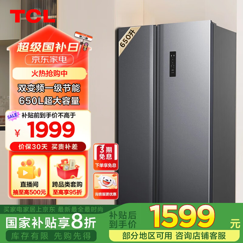 TCL 650升T3超大容量超薄冰箱对开双开门一级能效双循环风冷无霜一体双变频34分贝R650T3-S晶岩灰价格:1999.00元!