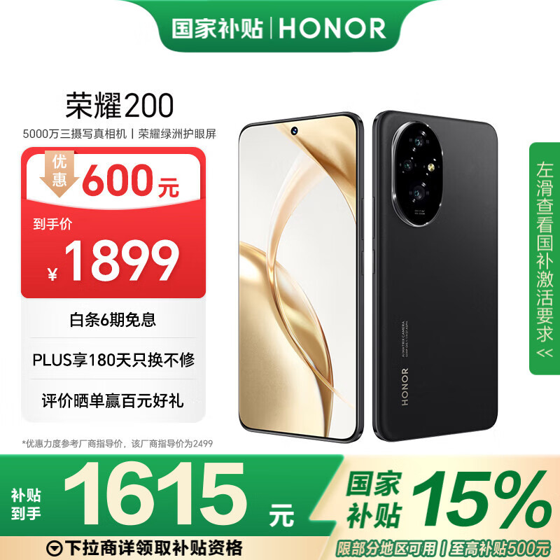 荣耀200 旗舰级青海湖电池 绿洲护眼屏 雅顾光影主摄 12+256 绒黑色 拍照5G AI 新款智能手机 政府补贴价格:1899.00元!