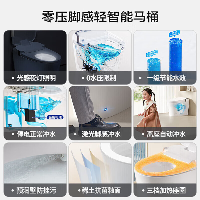 功能:抗菌,停电冲水,漏电保护,离座冲水,座圈加热,净化水质,坐温调节,柔和夜灯