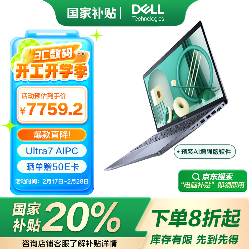 戴尔(DELL)补贴 Precision3590 15.6英寸笔记本 AIGC移动工作站 Ultra7 32G 1T RTX500Ada 适配DeepSeek价格:9699.00元!