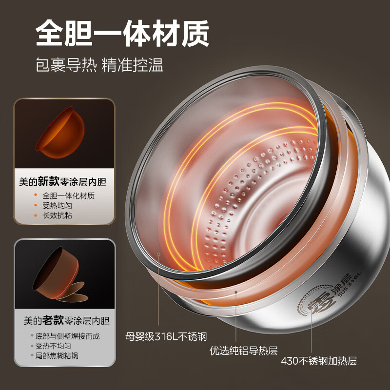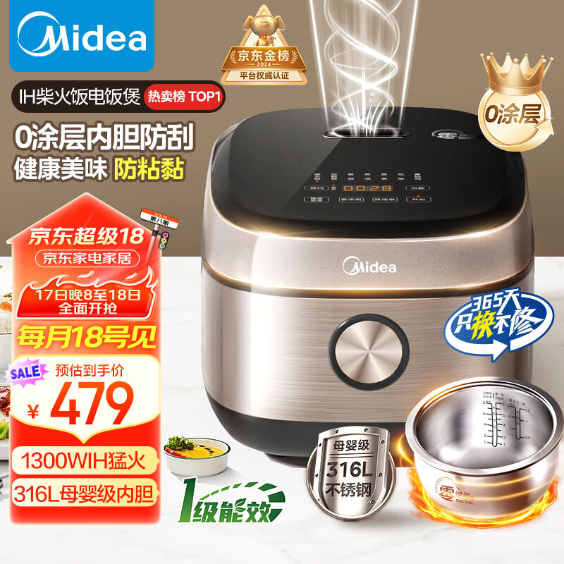 美的(Midea)0涂层电饭煲 IH加热 4L大容量316L不锈钢内胆家用多功能智能预约 4-5人电饭锅MB-HC459S价格:479.00元!