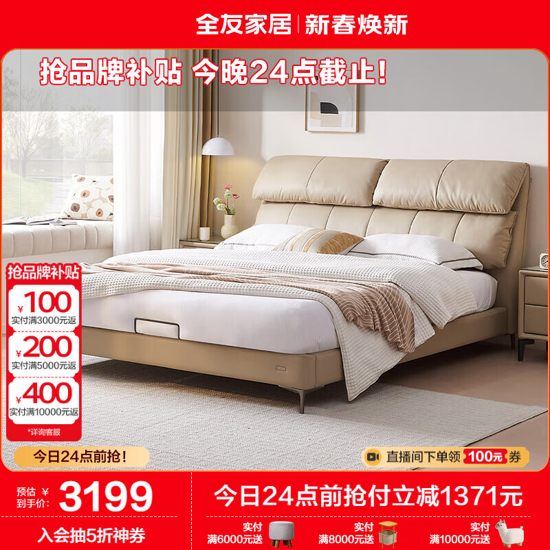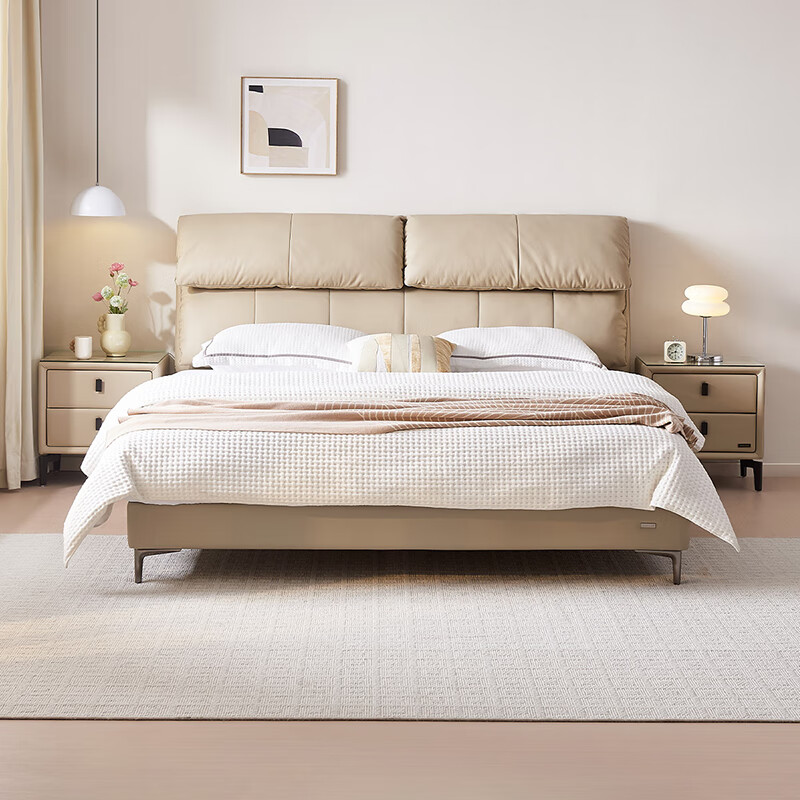 全友家居 现代简约真皮床1.8x2米主卧室大象耳朵头层牛皮双人床116068价格:4570.00元!