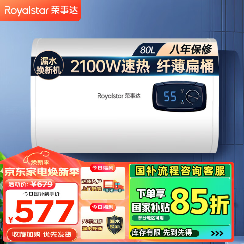 荣事达(Royalstar)80升电热水器扁桶 补贴 卫生间家用洗澡省电出租房小型储水式热水器超薄双胆速热RSD-F1-80价格:679.00元!
