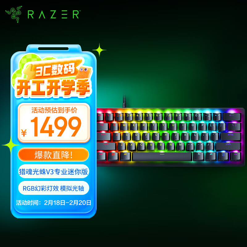 雷蛇猎魂光蛛V3专业迷你版 模拟光轴 机械键盘 有线键盘 电竞游戏键盘 61键 RGB幻彩 黑色价格:1499.00元!