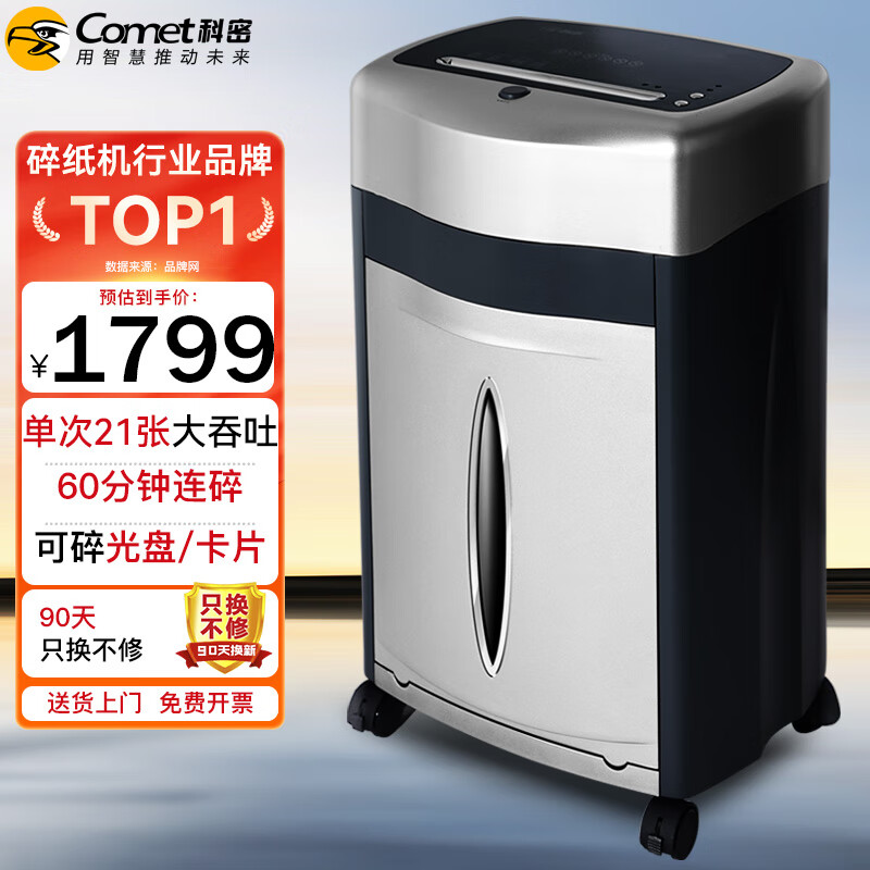 科密单次21张 持续60分钟办公商用碎纸机( 33L 可碎卡、光盘、订书针)铂金刚 comet价格:1899.00元!