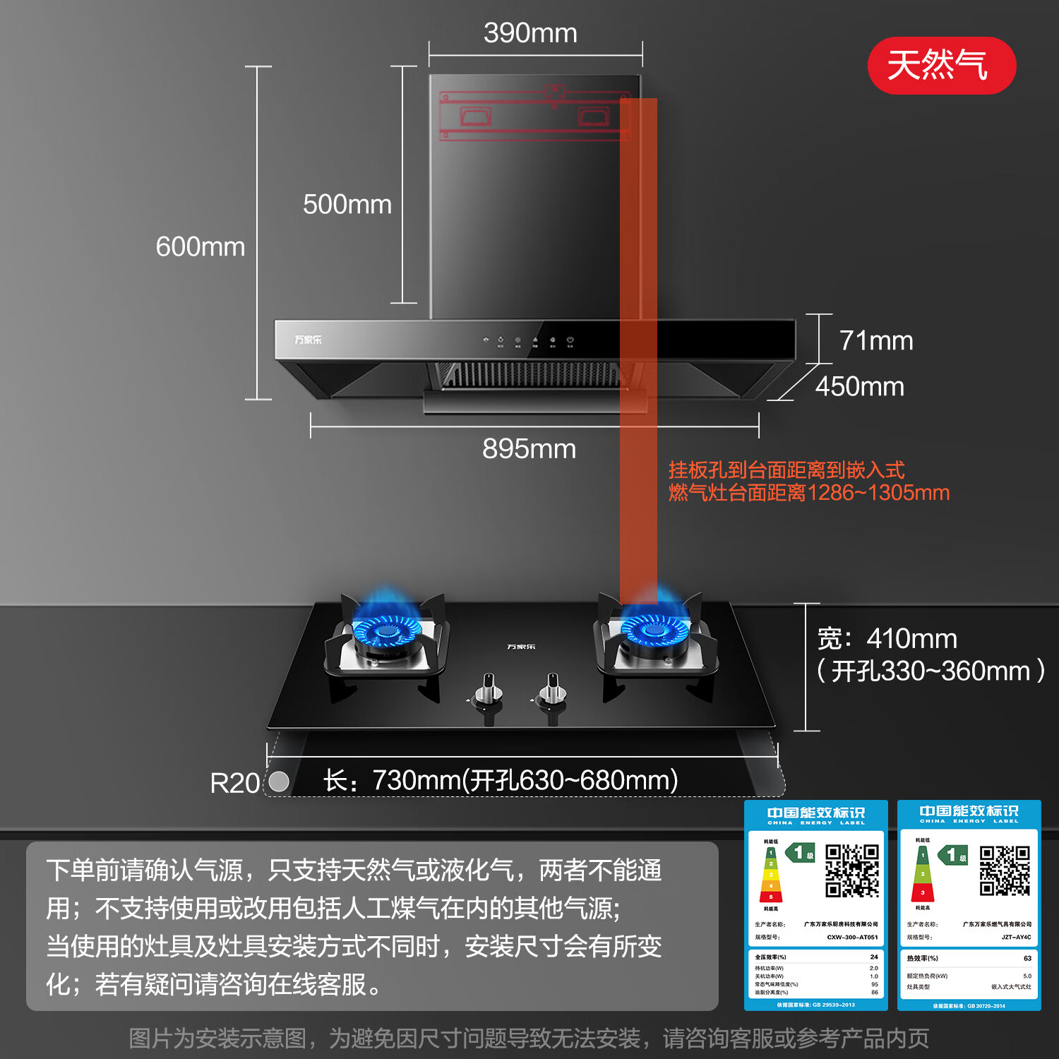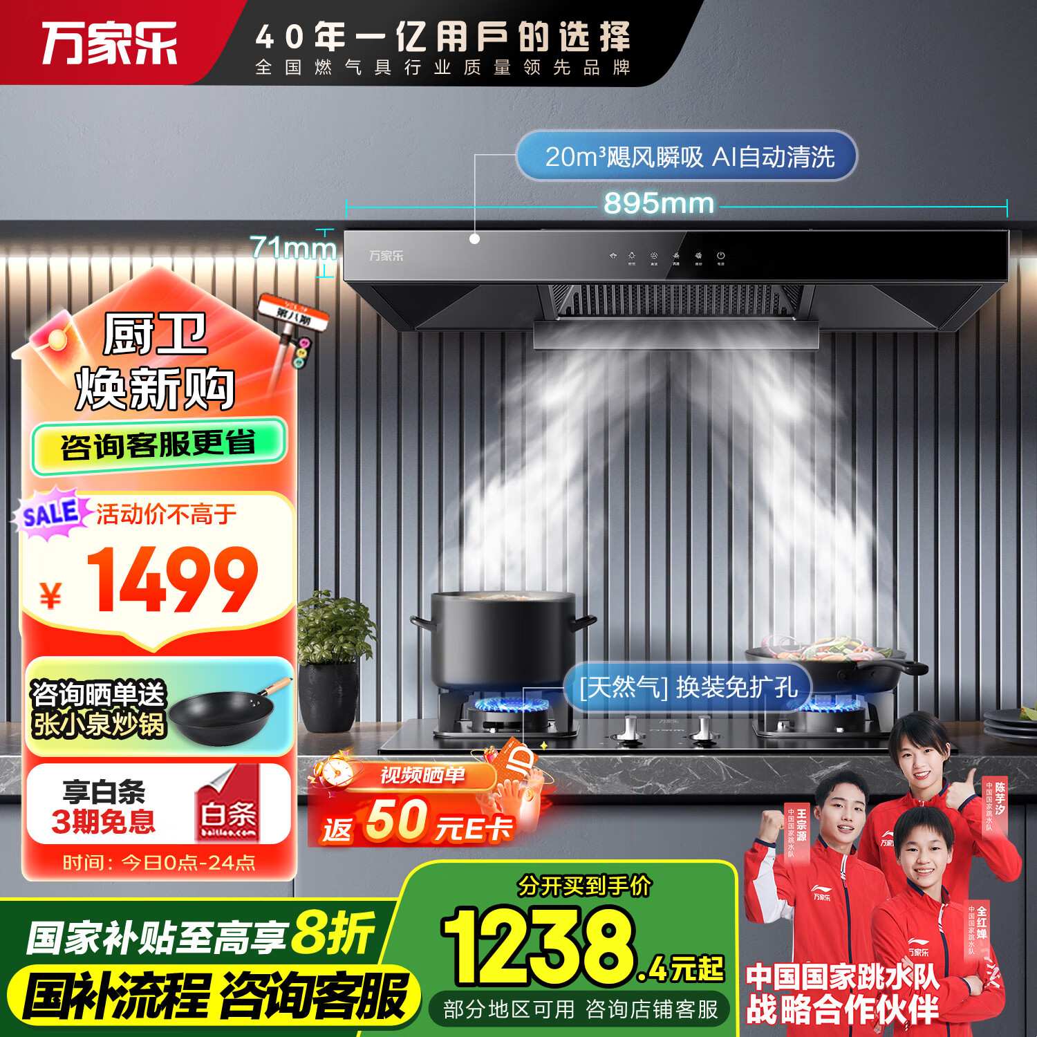 万家乐抽油烟机 欧式烟灶套装 20立方挥手自清洗油烟机5.0kW换新免扩孔燃气灶具套装AT051+AY4C天然气价格:1499.00元!