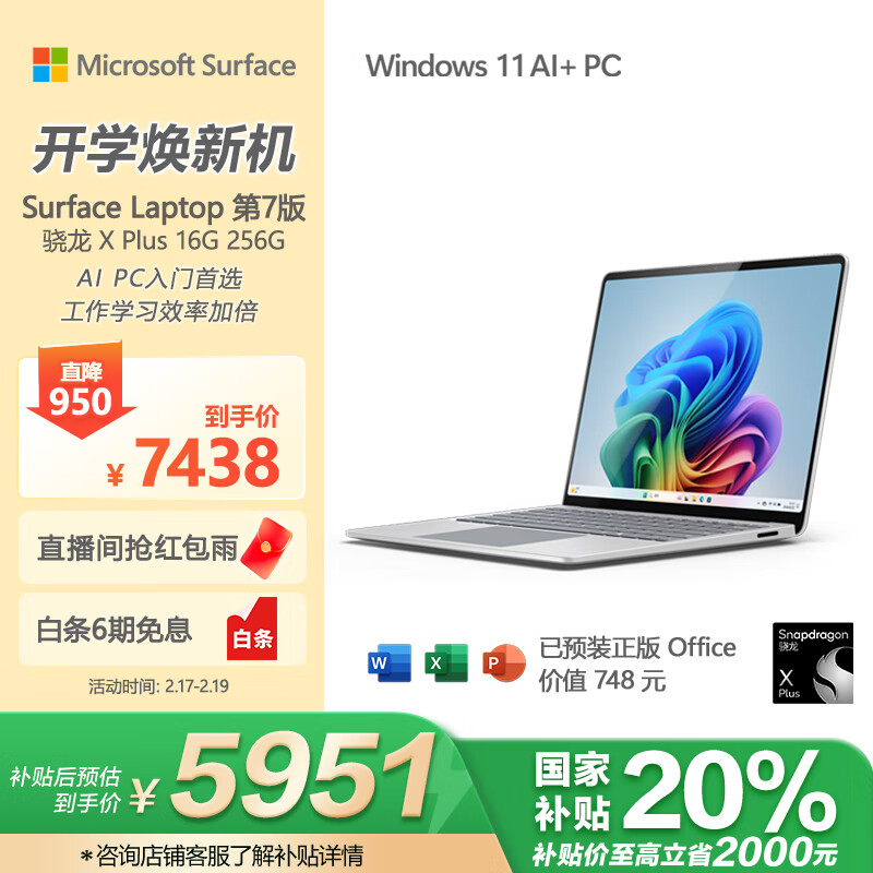 微软(Microsoft)补贴 全新Surface Laptop第7版 骁龙X Plus 16G 256G亮铂金 轻薄商务本触控笔记本电脑AIPC价格:7438.00元!