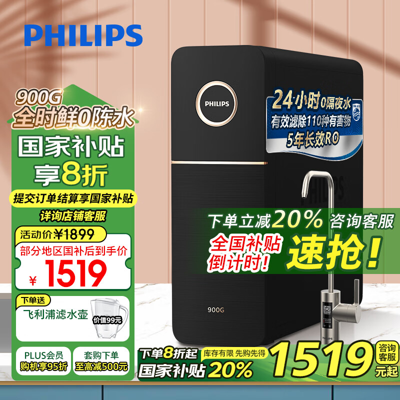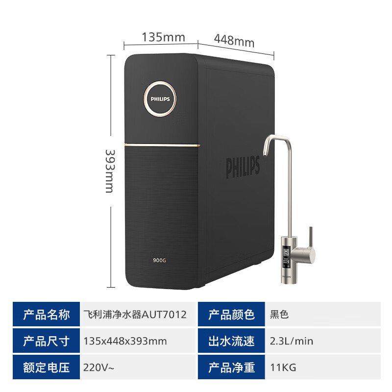飞利浦(PHILIPS)净水器家用净水机引擎Pro900G 5年RO反渗透 零陈水2.3L/分大流速 厨下式净水器净饮机 AUT7012价格:1899.00元!