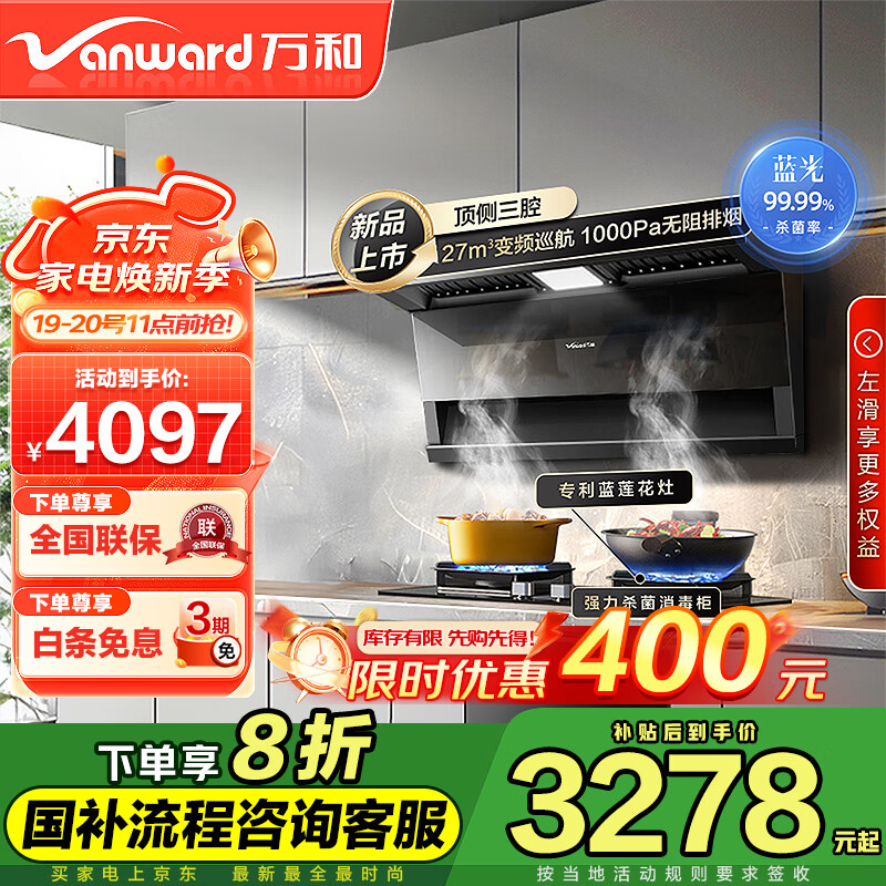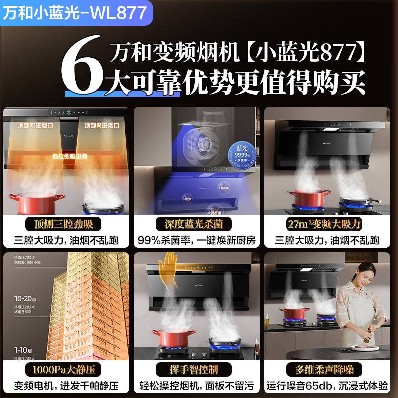 万和(Vanward)【小蓝光】抽油烟机顶侧三腔蓝光杀菌 燃气灶具紫外线消毒柜 烟灶消三件套WL877+B9L50+D8(天然气)价格:4296.00元!