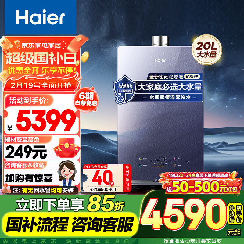 海尔(Haier)20升【K系列KN5】零冷水燃气热水器天然气家用 TSI增压大水量 汤泉级恒温 JSQ38-20KN5FXPGU1价格:5399.00元!
