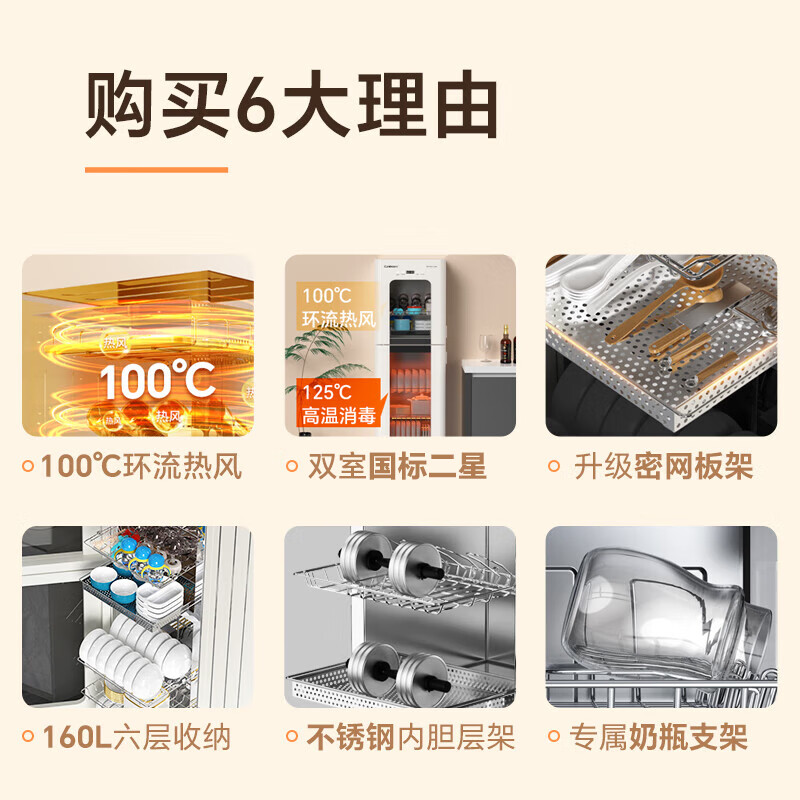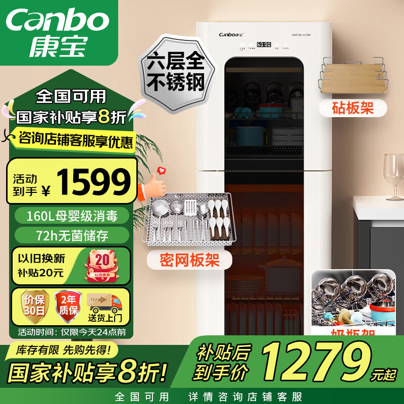 康宝(Canbo)消毒柜家用不锈钢立式大容量婴儿奶瓶碗筷高温二星热风消毒碗柜【补贴】XDZ160-LC3M价格:1599.00元!