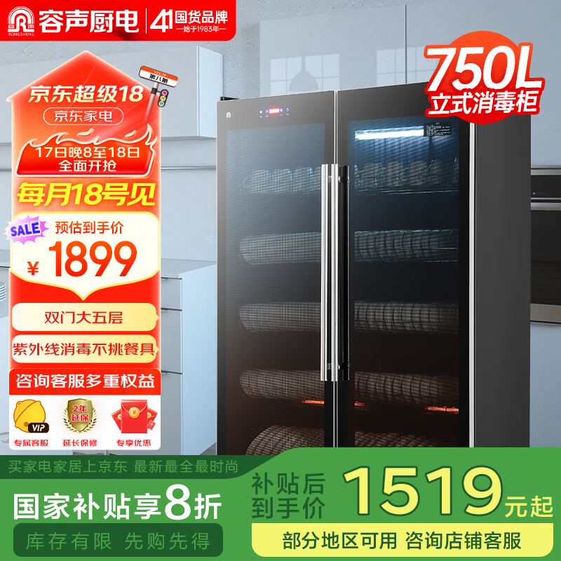 容声(RONGSHENG)消毒柜家用 立式 消毒碗柜 餐饮 双开门 家商两用 厨房商用 大容量750L保洁柜900-RD307价格:1899.00元!