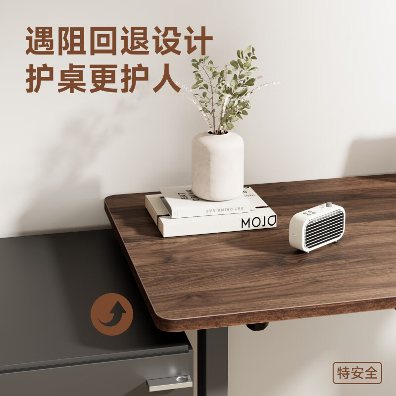 2、买的一米四长的大桌面,高度随意调节可以四档记忆,使用起来很方便,桌面非常厚实沉重,桌腿也很结实厚重,送的插座与桌面颜色协调好看,希望电机稳定可以用的久一点