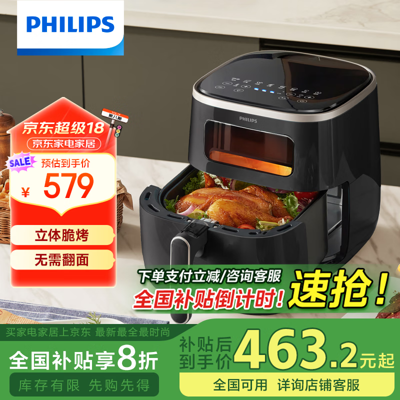 飞利浦(PHILIPS)【补贴】海星空气炸锅 家用5.6L大容量智能触屏 多功能全自动 HD9257价格:579.00元!