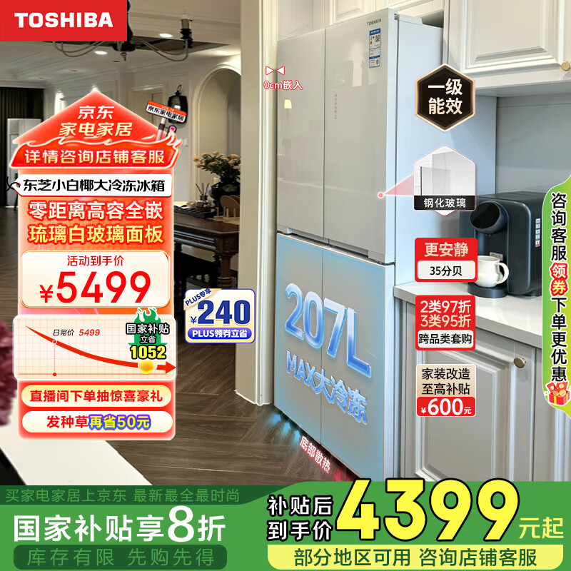 东芝(TOSHIBA)小白椰543超薄零嵌式十字对开四开门玻璃一级能效【补贴】白色家用电冰箱GR-RF543WI-PG1C5价格:5498.00元!