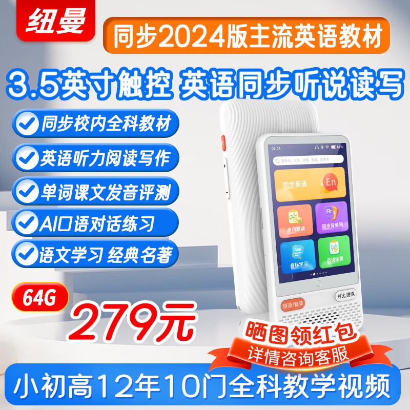 纽曼智能听力复读机英语口袋学习机神器听力宝随身听DL300小学初中同步教材练口语磨耳朵MP3 白色64G价格:339.00元!