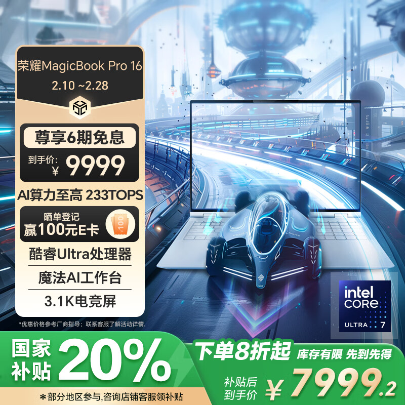 荣耀MagicBook Pro16HUNTER版【政府补贴20%】AI游戏本酷睿Ultra7 32+1T RTX4060 3K电竞屏 云霓色价格:9999.00元!