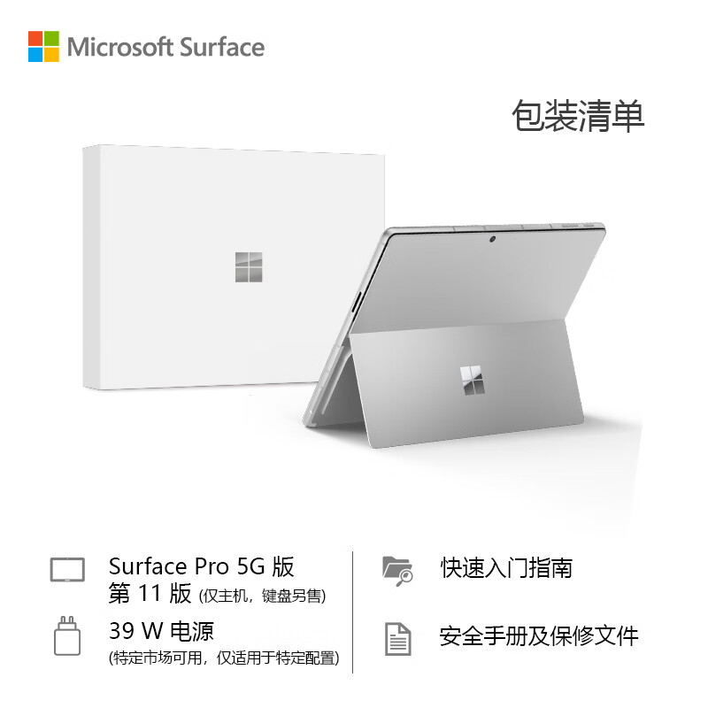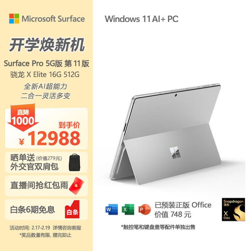 微软(Microsoft)Surface Pro第11版 二合一平板电脑笔记本AIPC Surface Pro11骁龙X Elite 16G+512G亮铂金 5G版价格:12988.00元!