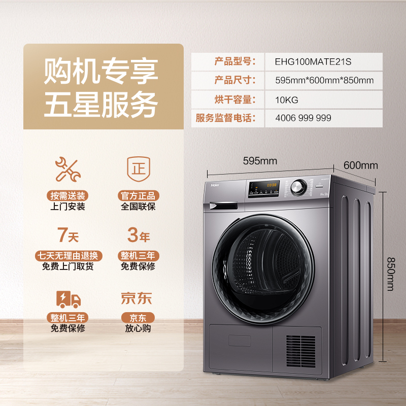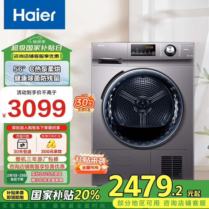 海尔(Haier)烘干机家用 10公斤热泵干衣机 烘衣机 速烘节能 除菌除潮除螨 EHG100MATE21S 以旧换新价格:3099.00元!