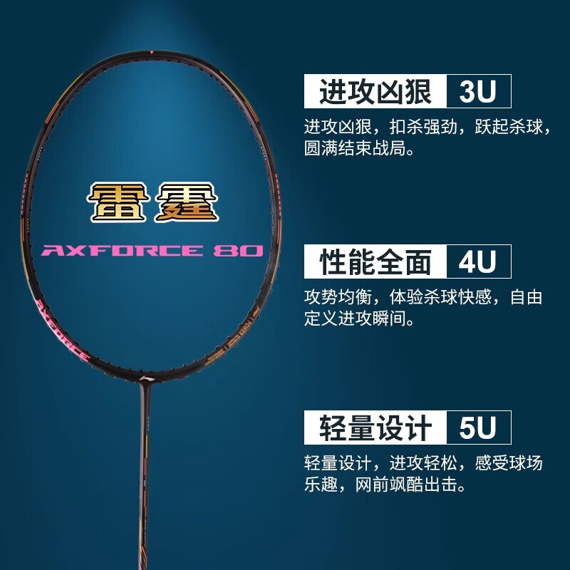 李宁(LI-NING)羽毛球拍雷霆80全碳素谌龙战拍进攻型黑金配色高端球拍 4U空拍价格:1229.00元!