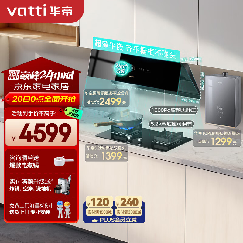 华帝(VATTI)【小旋风】官方抽油烟机家用变频24风量吸油烟机灶具热水器多件套装A6+72B+152-16(天然气)价格:4599.00元!