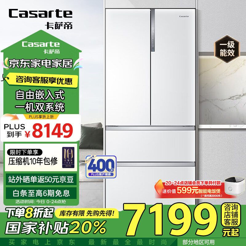 卡萨帝(Casarte)555升原石系列超薄法式多门四开门超大容量自由嵌入式一级能效补贴20%冰箱BCD-555WDGAU1价格:8999.00元!