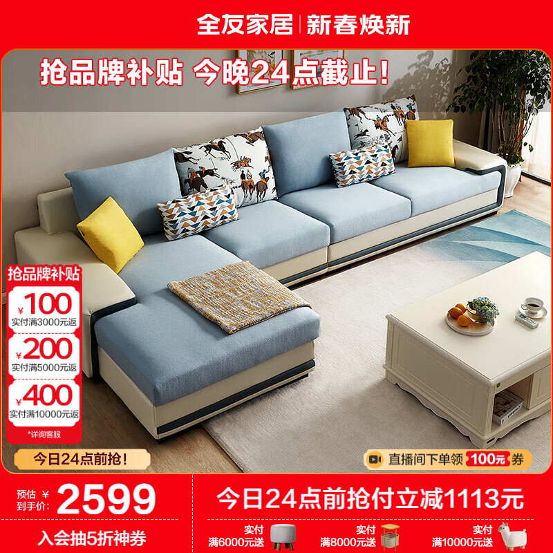 全友家居 现代简约家用大户型贵妃转角沙发客厅实木架布艺沙发102085价格:3712.86元!