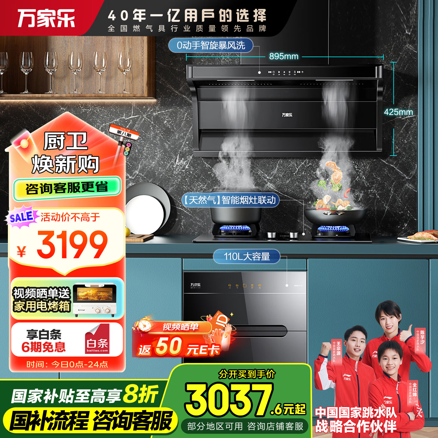 万家乐 抽油烟机 顶侧双吸油烟机厨房烟灶消三件套26立方油烟机灶具消毒柜套装AK6+KV063B+DQ052天然气价格:3199.00元!