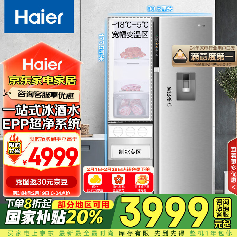 海尔(Haier)585升侧T型双开门三开门电冰箱家用制冰保鲜超薄变频节能风冷无霜BCD-585WGHFTH7S7U1补贴20%价格:5499.00元!