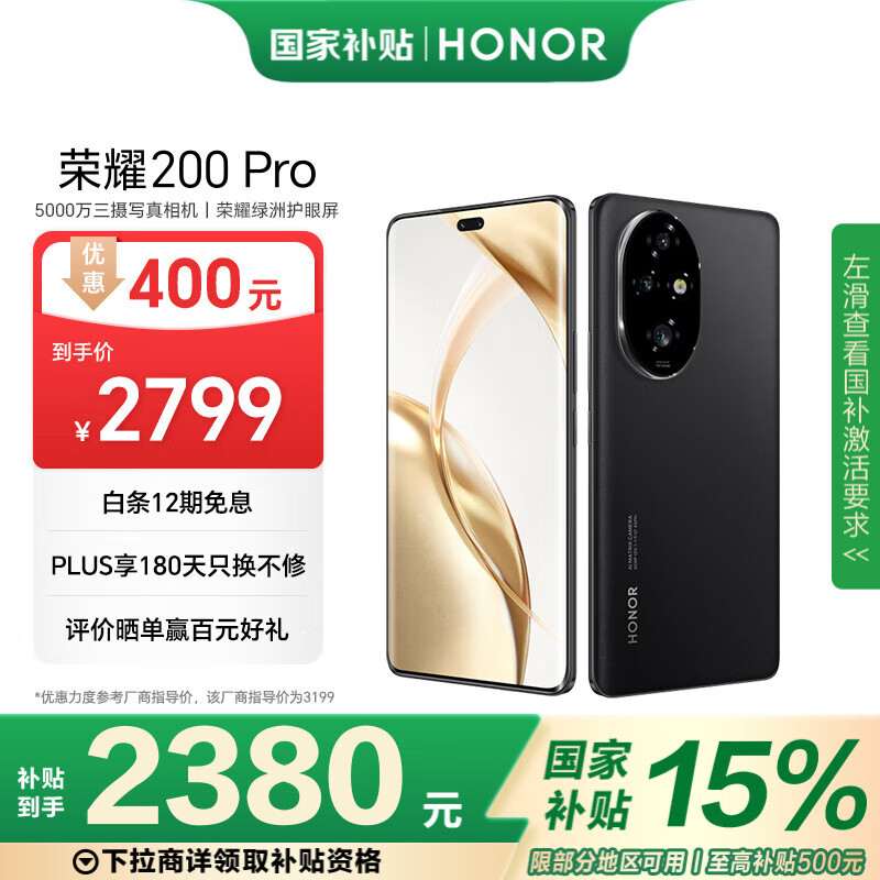 荣耀200 Pro 旗舰级青海湖电池 绿洲护眼屏 雅顾光影主摄 12+256 绒黑色 拍照 AI 新款5G手机 政府补贴价格:2799.00元!