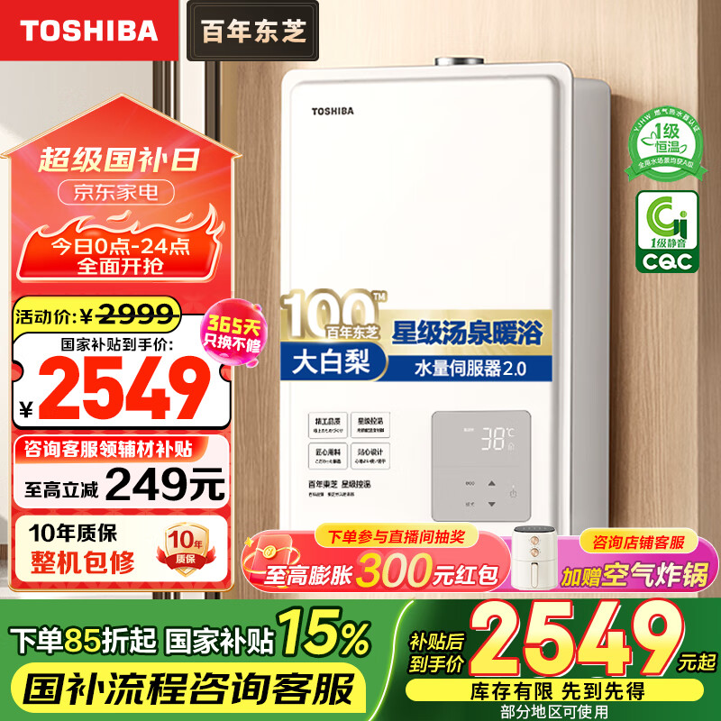 东芝(TOSHIBA)【大白梨TL10】16升燃气热水器 一级静音一级恒温水伺服2.0下置风机 补贴立减15% 以旧换新价格:2999.00元!