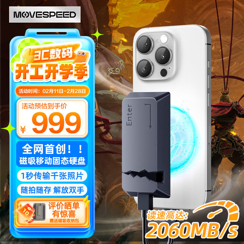 移速(MOVE SPEED)2TB 移动固态硬盘 (PSSD) ssd移动硬盘 可磁吸手机 适用Iphone16Promax苹果手机直连 读数2060MB/S价格:999.00元!