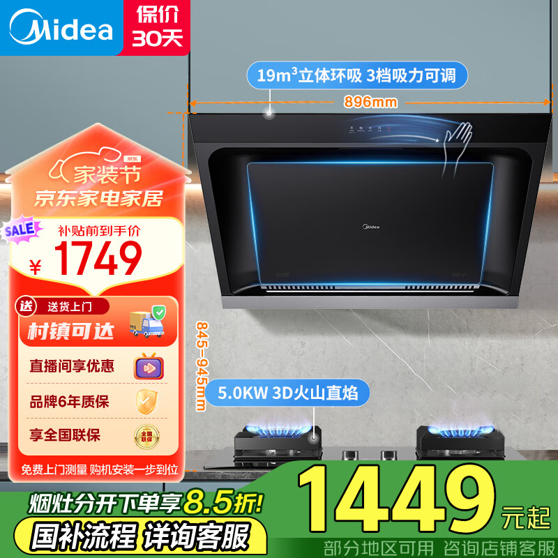 美的(Midea)抽烟机燃气灶套装 家用19风量侧吸自动清洗脱排烟机油烟机 5.0kW一级能效灶JP32+Q230A天然气价格:1749.00元!