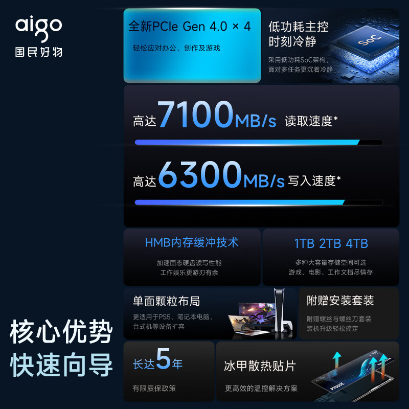 爱国者(aigo)4TB SSD固态硬盘 M.2接口(NVMe协议PCIe4*4)长江晶圆联芸主控 P7000E读速7100MB/s PS5台式机扩展价格:1399.00元!