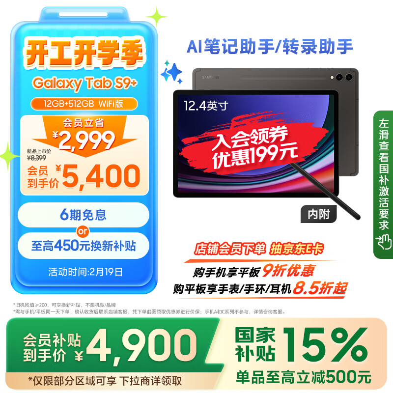 三星 Samsung【政府补贴】S9+ 12.4英寸平板电脑/AI智享学习办公/骁龙8Gen2 12G+512GB 云影灰WIFI价格:5599.00元!