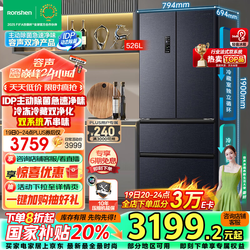 容声526升双净双系统法式多门四开门电冰箱家用一级能效风冷无霜变频节能BCD-526WD1MPA灰补贴20%价格:4498.99元!