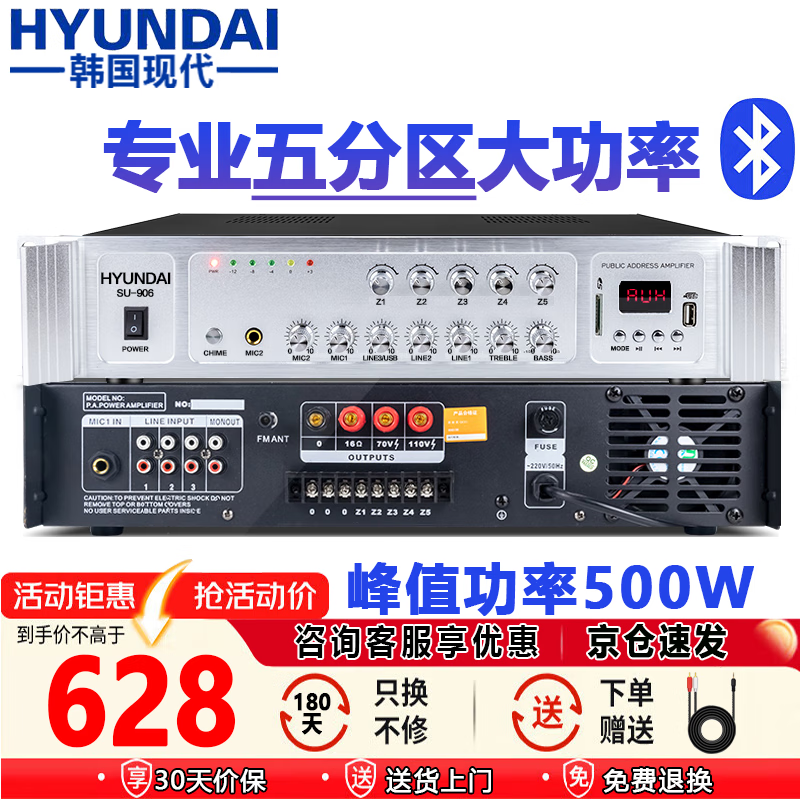 HYUNDAI现代 SU-906专业定压大功率功放机 蓝牙功放公共广播吸顶音响吊顶喇叭五分区控音峰值功率500W价格:698.00元!