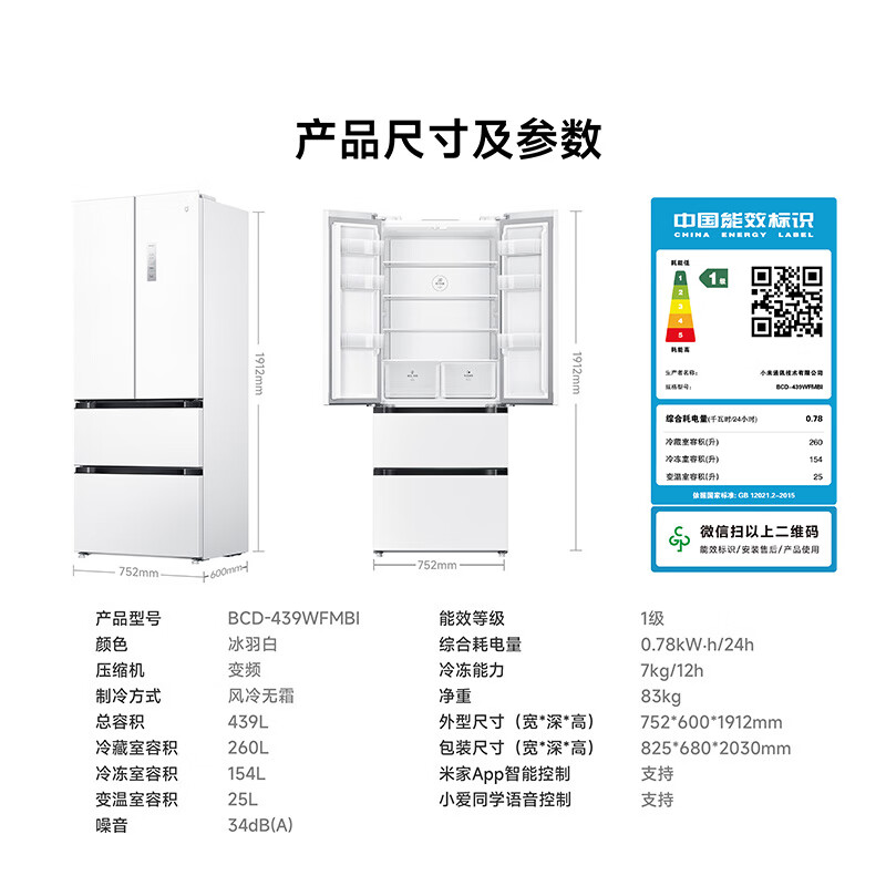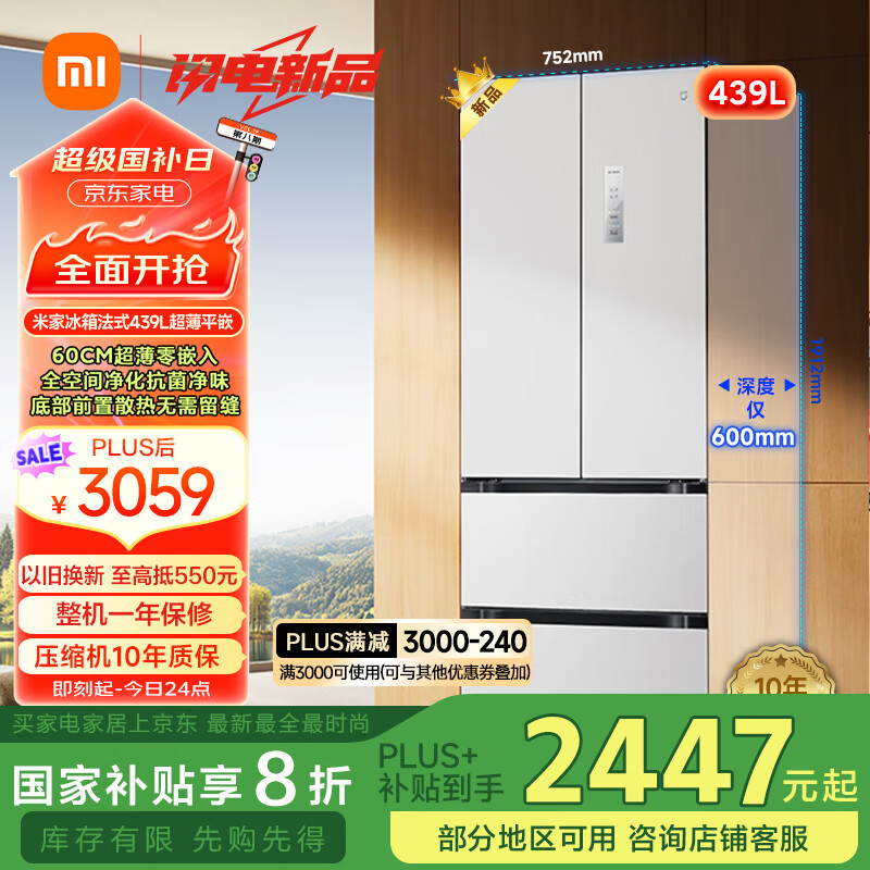 米家小米【补贴20%】439L法式多门家用一级变频60cm超薄零嵌冰箱 以旧换新官方正品BCD-439WFMBI价格:3299.00元!