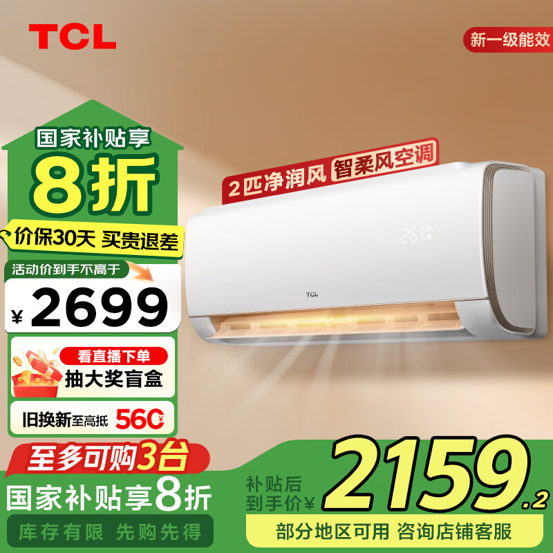 TCL空调 2匹新一级能效 净润风 智能变频冷暖柔风 空调挂机KFRd-46GW/D-STA22Bp(B1)以旧换新补贴价格:2699.00元!