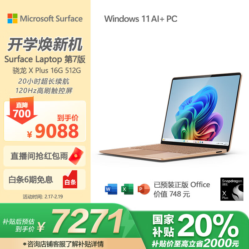 微软(Microsoft)补贴 全新Surface Laptop第7版 骁龙X Plus 16G 512G沙漫金 轻薄触控学生设计笔记本电脑AIPC价格:9088.00元!