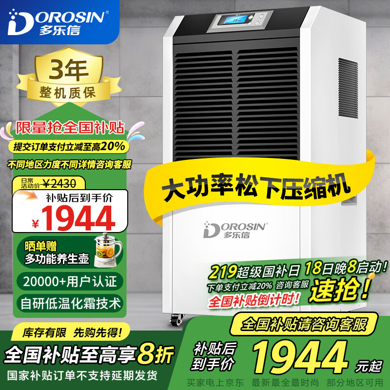 多乐信(DOROSIN)除湿机/抽湿机 150-350平方米 车间仓库地下室别墅工业大功率除湿器DR-1502L价格:2430.00元!