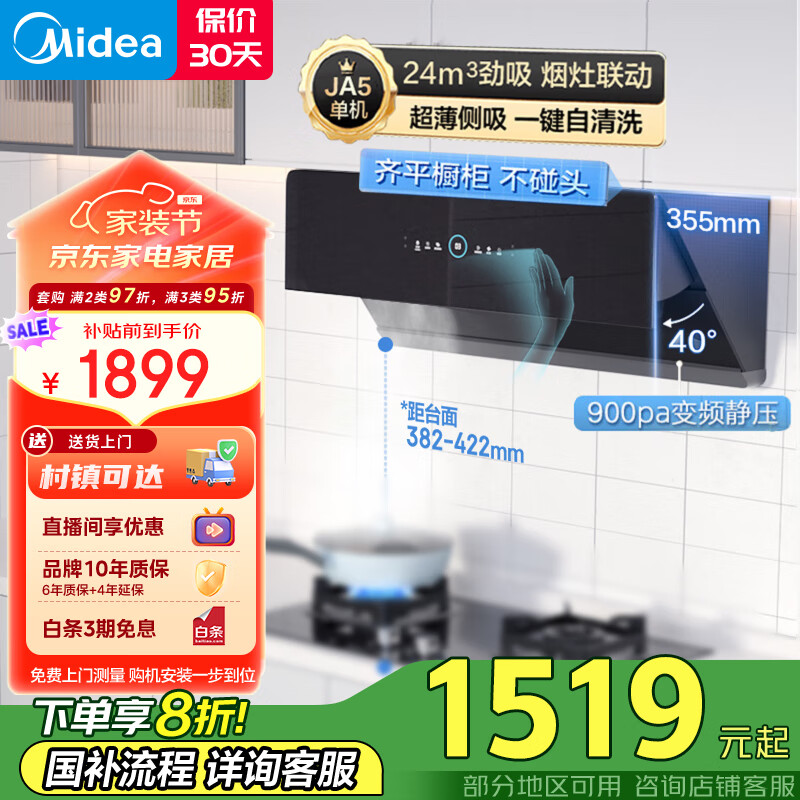 美的(Midea)抽油烟机家用厨房侧吸式24大风量变频挥手自动清洁超薄近吸烟机 排油烟机JA5补贴立减20%价格:1899.00元!