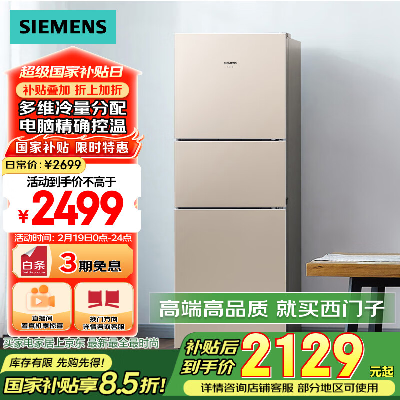 西门子(SIEMENS)271升风冷三门大容量家用冰箱 家电补贴 三开门 双效过滤控温浅金色BCD-271W(KG28NV230C)价格:2499.00元!