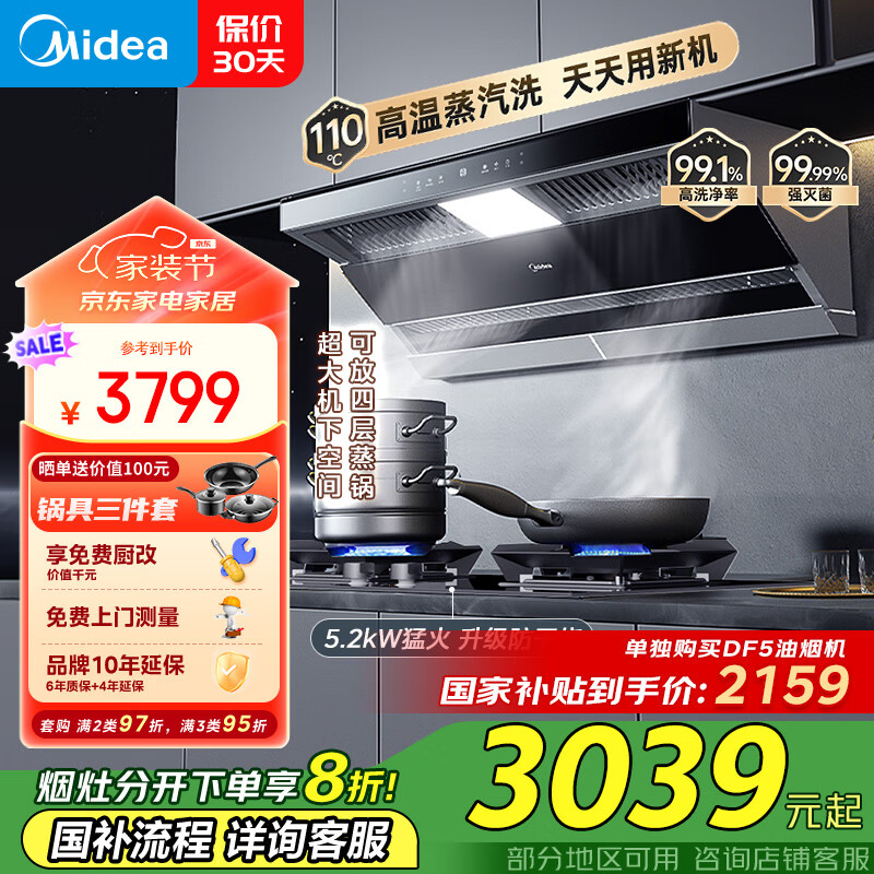 美的抽油烟机 家用厨房顶侧双吸23吸力蒸汽洗排油烟机5.2kW 防干烧烟灶联动套装DF5+Q230S-L天然气价格:3699.00元!