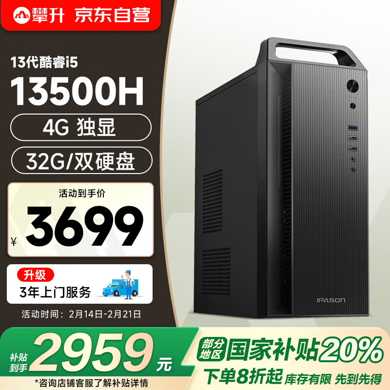 攀升商睿2Pro 设计师办公商用台式电脑台式机电脑主机全套整机(13代酷睿i5 32G 256+2T 4G独显 WiFi)价格:3899.00元!
